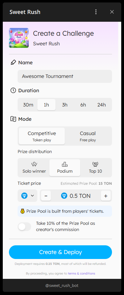 For example, for Sweet Rush it would be https://t.me/sweet_rush_bot/game?startapp=league-<TOURNAMENT_ID>.